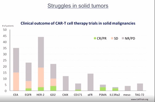 2017年以來,美國食品藥品監督管理局接連批準諾華公司的Kymriah 和 Kite 制 藥 的 Yescarta上市,使CAR-T 療法開始出現在大眾視野,并逐漸成為最具前景的腫瘤治療方式之一。近年 CAR-T在血液系統腫瘤治療,尤其是靶向CD19 CAR-T在急性難治型淋巴細胞白血病治療中,取得了矚目成就。然而,CAR-T在實體瘤的攻堅上仍處于一個初期階段。按照雷博士的話說,為數不多的靶點,腫瘤微環境、腫瘤異質性、On Target Off-tumor所導致的副作用都是限制CAR-T療法在實體瘤領域發揮的重要因素。