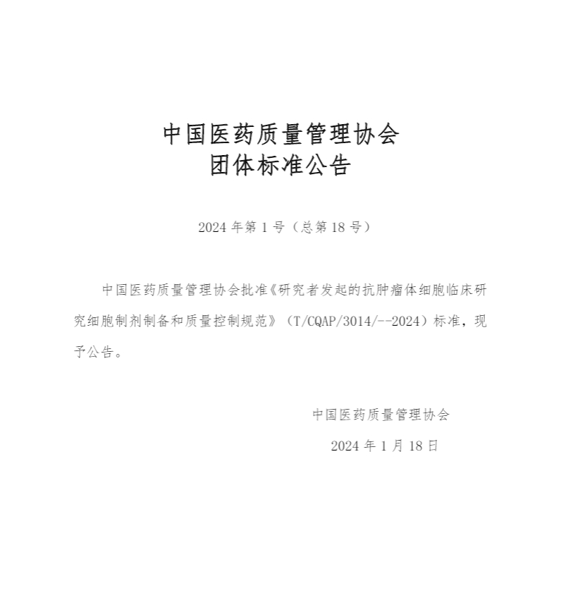 2024年5月1日,由中國醫(yī)藥質(zhì)量管理協(xié)會發(fā)布的《研究者發(fā)起的抗腫瘤體細(xì)胞臨床研究細(xì)胞制劑制備和質(zhì)量控制規(guī)范》(T/CQAP 3014—2024)標(biāo)準(zhǔn)(以下簡稱“標(biāo)準(zhǔn)”)將正式實(shí)施。