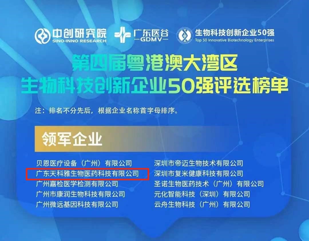 2021年12月29日,第四屆粵港澳大灣區(qū)生物科技創(chuàng)新企業(yè)50強(qiáng)頒獎(jiǎng)典禮暨生物科技創(chuàng)新發(fā)展峰會(huì)將于廣州南沙舉辦,現(xiàn)場(chǎng)進(jìn)行第四屆粵港澳大灣區(qū)生物科技創(chuàng)新企業(yè)50強(qiáng)頒獎(jiǎng)典禮,天科雅榮獲“第四屆生物科技創(chuàng)新企業(yè)50強(qiáng)-領(lǐng)軍企業(yè)獎(jiǎng)”。