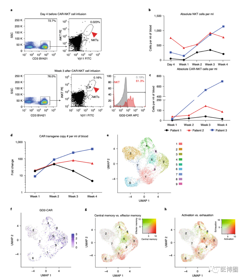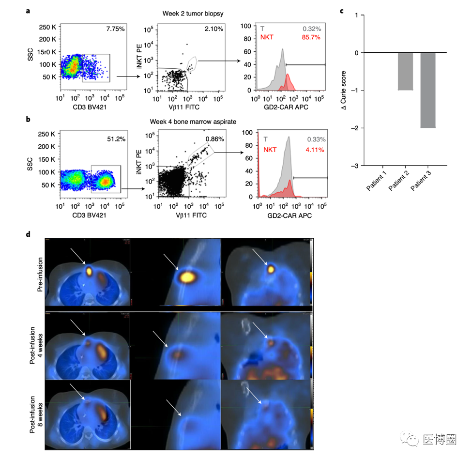 a 通過流氏細胞檢測技術,病人3在輸入NKT細胞之前,之后的NKT細胞的比例,以及周邊血樣本GD2-CAR的表達。在輸入NKT細胞4天前的CAR-NKT細胞比例是0.023%,輸入CAR-NKT細胞3個星期之后,NKT細胞比例提升到了0.16%。柱形圖展現了在輸入NKT細胞三個星期之后,CAR的表達(紅色,61.3%)和陰性對照(灰色,0.19%)相比。